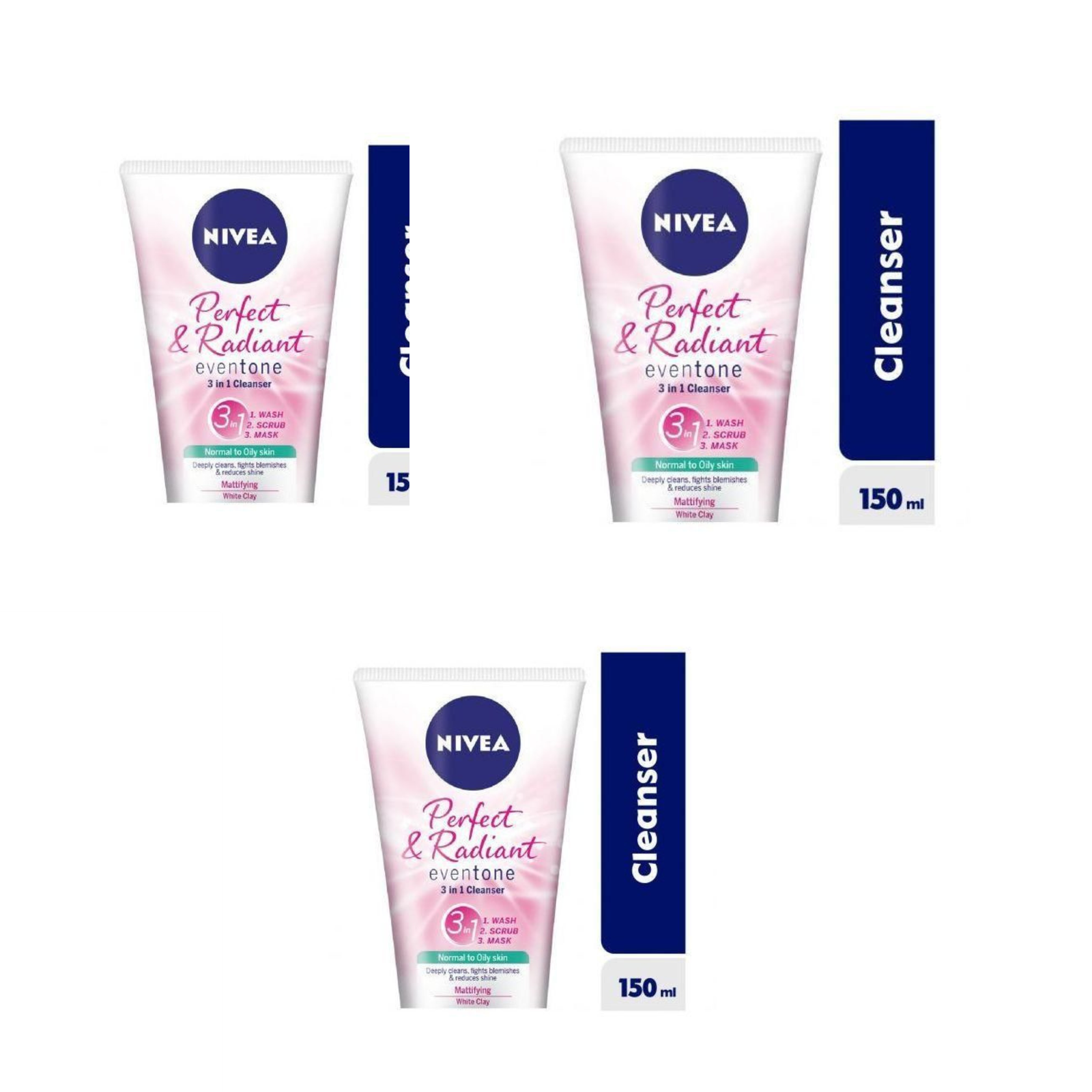 NIVEA Perfect & Radiant 3‑In‑1 Face Cleanser 3PCS 150ml — Brighten oily skin fast. This value pack includes three full‑size tubes of a mattifying white clay cleanser formulated to deeply cleanse, gently exfoliate, and act as a clarifying mask for normal to oily, blemish‑prone skin. Visible reduction in shine and improved skin tone with regular use.